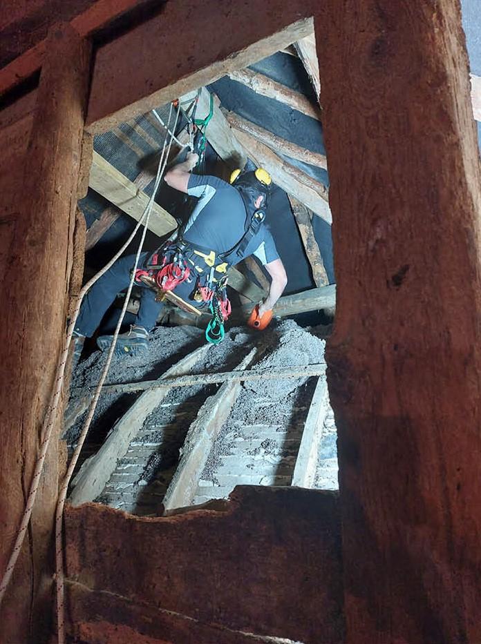 Ce chantier mené par un garde-moniteur, a demandé un savoir-faire de cordiste en interne afin d’accéder au-dessus des voutes d’une petite chapelle en lattis plâtre très fragile.