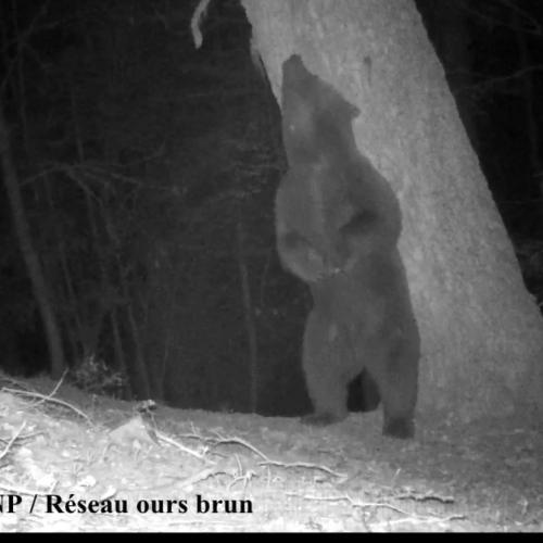 Un appareil automatique installé en partenariat entre le FIEP et le Parc National des Pyrénées, dans le cadre du suivi du Réseau ours brun, a capté une vidéo d’un ours brun, le 6 mai 2023, en zone cœur de Parc National en vallée d'Ossau. Il s'agit très certainement de l'ours Rodri. Remarquons l’activité de marquage de l’ours sur cet arbre afin de laisser son odeur pour se signaler à ses congénères, ainsi que son activité prononcée de recherche par l'odorat, d'indices de passage d'autres ours, notamment des femelles.